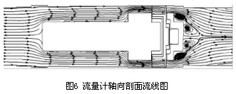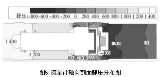 以流量Q=250m3/h的數(shù)值模擬計算結(jié)果為例進行渦輪流量計內(nèi)部流場及壓力場的分析,圖5為渦輪流量計軸向剖面靜壓分布圖,前導(dǎo)流器前后的壓力場分布較均勻且壓力梯度較小,在機芯殼體與葉輪支座連接凸臺處壓力有所增加,連接面后壓力又逐漸減小,故認(rèn)為流體流經(jīng)葉輪支座產(chǎn)生壓力損失的主要原因是連接處存在凸臺,導(dǎo)致流場出現(xiàn)較大變化,不能平滑過渡,建議將葉輪支座與機芯殼體的連接改為圓弧線型或流線型。觀察圖5和圖6,當(dāng)流體流經(jīng)葉輪從后導(dǎo)流器流出渦輪流量計時,壓力梯度變化明顯,存在負(fù)壓區(qū)域并造成很大的壓降,在后導(dǎo)流器凸臺及流量計出口處速度變化明顯,由于氣流通過后導(dǎo)流器后流道突擴,在后導(dǎo)流器背面形成明顯的低速渦區(qū),產(chǎn)生了漩渦二次流。