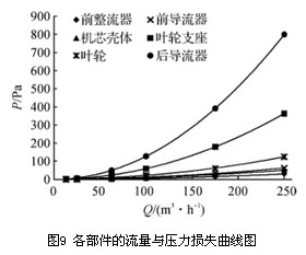 流量計各部件的壓力損失隨流量變化的趨勢與流量計總壓力損失隨流量的變化趨勢相同,其擬合公式為系數(shù)不同的二次多項式。各部件的壓力損失與流量呈二次函數(shù)關(guān)系,隨著流量的增加,壓力損失顯著增加。