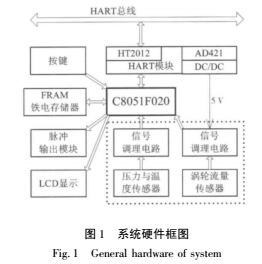 渦輪流量計表頭主要包括核心控制器件C8051F020、流量脈沖信號采集模塊、HART模塊、脈沖輸出模塊、累計流量存儲模塊、顯示與鍵盤處理模塊,硬件總體框圖如圖1所示。