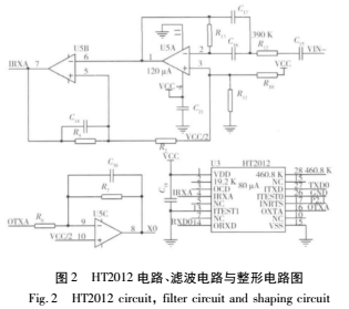 HART協(xié)議通信模塊主要由HART調制解調器HT2012和D/A轉換器AD421及其外圍電路實現(xiàn)。HART MODEM采用Smar公司的HT2012,是符合Bell202標準的半雙工調制解調器,實現(xiàn)HART協(xié)議規(guī)定的數(shù)字通信的編碼或譯碼。該芯片專為HART儀器設計,片內集成了符合Bell202標準的調制器、解調器、時鐘及定時電路、檢測控制電路,性價比較高。其中AD421通過串行接口接收現(xiàn)場儀表內部MCU傳送的數(shù)字信號,轉換成4~20mA電流輸出,輸出主要的測量結果。HT2012則從VIN-節(jié)點接收疊加在4~20mA環(huán)路上的信號,對其帶通濾波和放大之后進行載波檢測,如果檢測到FSK頻移鍵控信號,則將IRXA節(jié)點上的 1.2kHz的信號解調為‘1’,將IRXA節(jié)點上的2.2kHz信號解調為‘0 ’,并通過串口通信RXD0節(jié)點傳輸給C8051F020,C8051F020接收命令幀并作相應的數(shù)據(jù)處理。之后,C8051F020產(chǎn)生要發(fā)回的應答幀,應答幀的數(shù)字信號由HT2012調制成相應的1.2kHz和2.2kHz的頻移鍵控(FSK)信號,即節(jié)點TXD0到節(jié)點OTXA的調制過程,并經(jīng)過發(fā)送信號整形電路進行波形整形后,經(jīng)AD421疊加在環(huán)路上發(fā)送。C8051F020外接1.8432MHz晶振,4分頻后作為HART調制解調的時鐘信號源,電路圖如圖2所示。