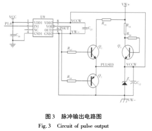 脈沖輸出模塊主要由高速光耦隔離器、穩(wěn)壓電路構成。脈沖輸出是采用控制 P1.4口的高低電平翻轉來實現(xiàn)的??紤]到儀表安全性,流量計的脈沖輸出模塊均需要隔離保護。選用功耗低的高速CMOS信號隔離器,一端由AD421的輸出電壓VCC 3V供電,另一端由用戶供電。用戶通常提供DC 12V或DC 24V電源,所以采用穩(wěn)壓管Z1穩(wěn)壓5V給光耦另一端供電,如圖3所示,其中VW+,VW-為用戶提供的外接DC 12V或DC 24V電源輸入端,Q1,Q2為三*管。脈沖輸出時,當P1.4為高電平,POUT為高電平,Q1導通,Q2截止,節(jié)點PLUSEO輸出高電平;當P1.4為低電平,POUT為低電平,Q1截止,Q2導通,節(jié)點PLUSEO輸出低電平。