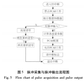 HART通信協(xié)議采用問答式,即上位機(主機)向下位機發(fā)出命令,下位機(從機)回答。主機消息到來時,通過觸發(fā)串口中斷來接收和發(fā)送數(shù)據(jù)。主循環(huán)程序還包括檢測溫度并送LCD顯示的子程序模塊,4~20mA電流輸出子程序模塊,累計流量寫鐵電子程序模塊等。系統(tǒng)主函數(shù)流程圖如圖4所示,脈沖采集、脈沖輸出流程圖如圖5所示。