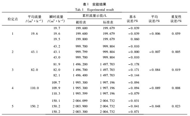 根據(jù)渦輪流量傳感器的工作特性曲線,將流量測量范圍0~160m3/h平均分為5段,每一段選取一個檢定點,每個檢定點測試3次,分段修正儀表系數(shù),用累計流量計算示值誤差,在耐德流量實驗室的基于標準法柴油標準裝置上進行了檢定測試。由于檢定裝置的誤差不超出被檢流量計的基本誤差限的1/3就可忽略不計,故流量計基本誤差近似等于流量計示值誤差。使用累積流量計算示值誤差(基本誤差)的方法為