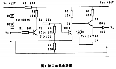 調試時,先將接口單元的輸出端接1k電阻,然后將輸入端接1.5V電壓,逐步減小電阻R5的值,直至輸出端電壓上升到10V;若不能達到此值,則可能是三*管T3的直流放大倍數過低。逐步降低輸入端的電壓直至1.2V,此時輸出端應為零。若不能可靠地回零,則可能是電阻R5的值過小。